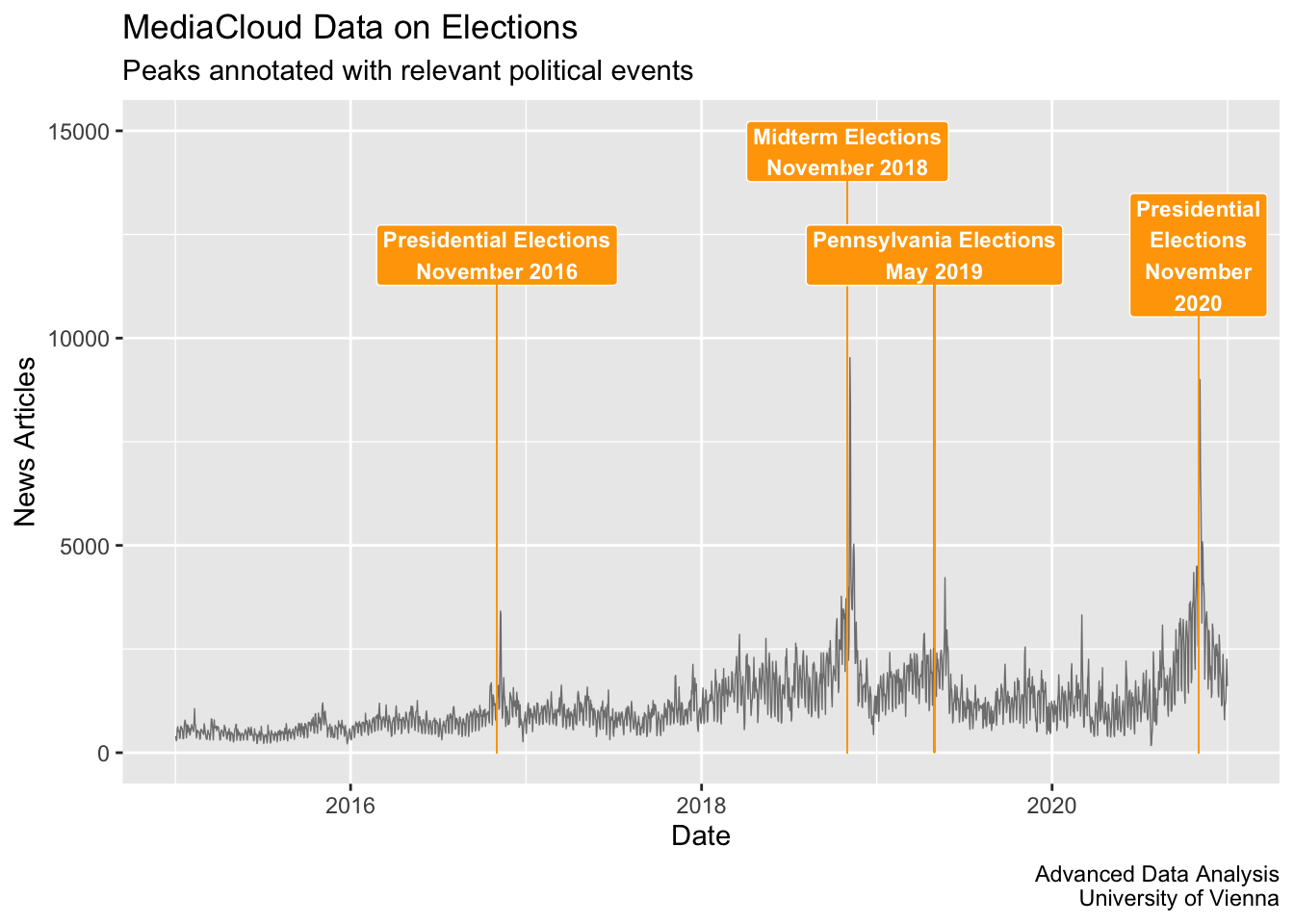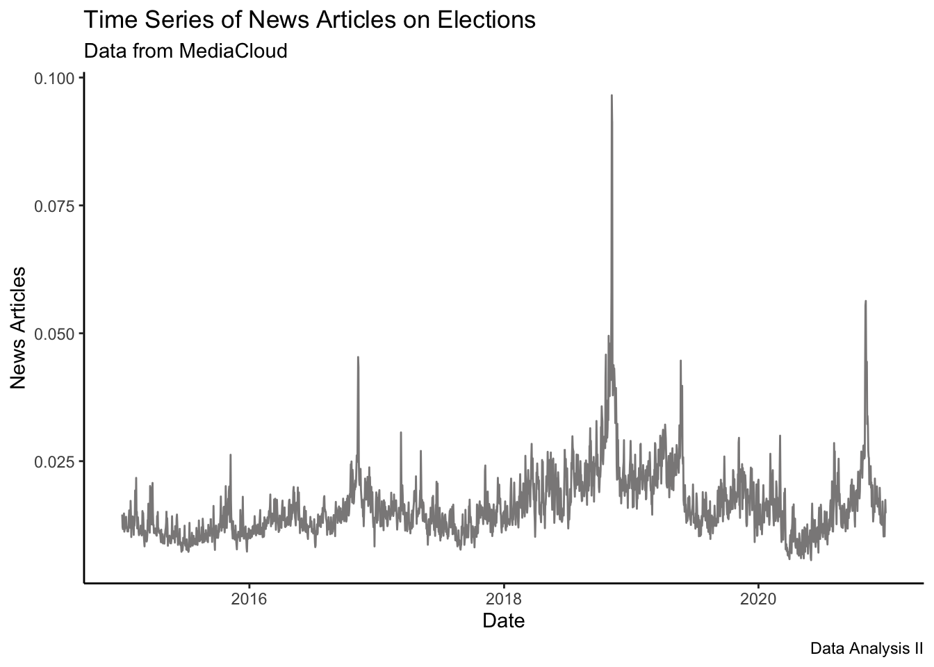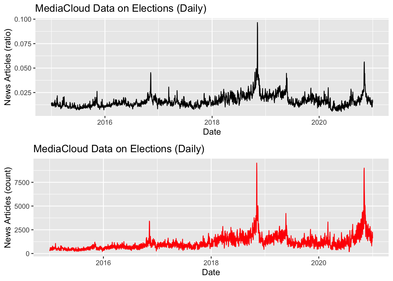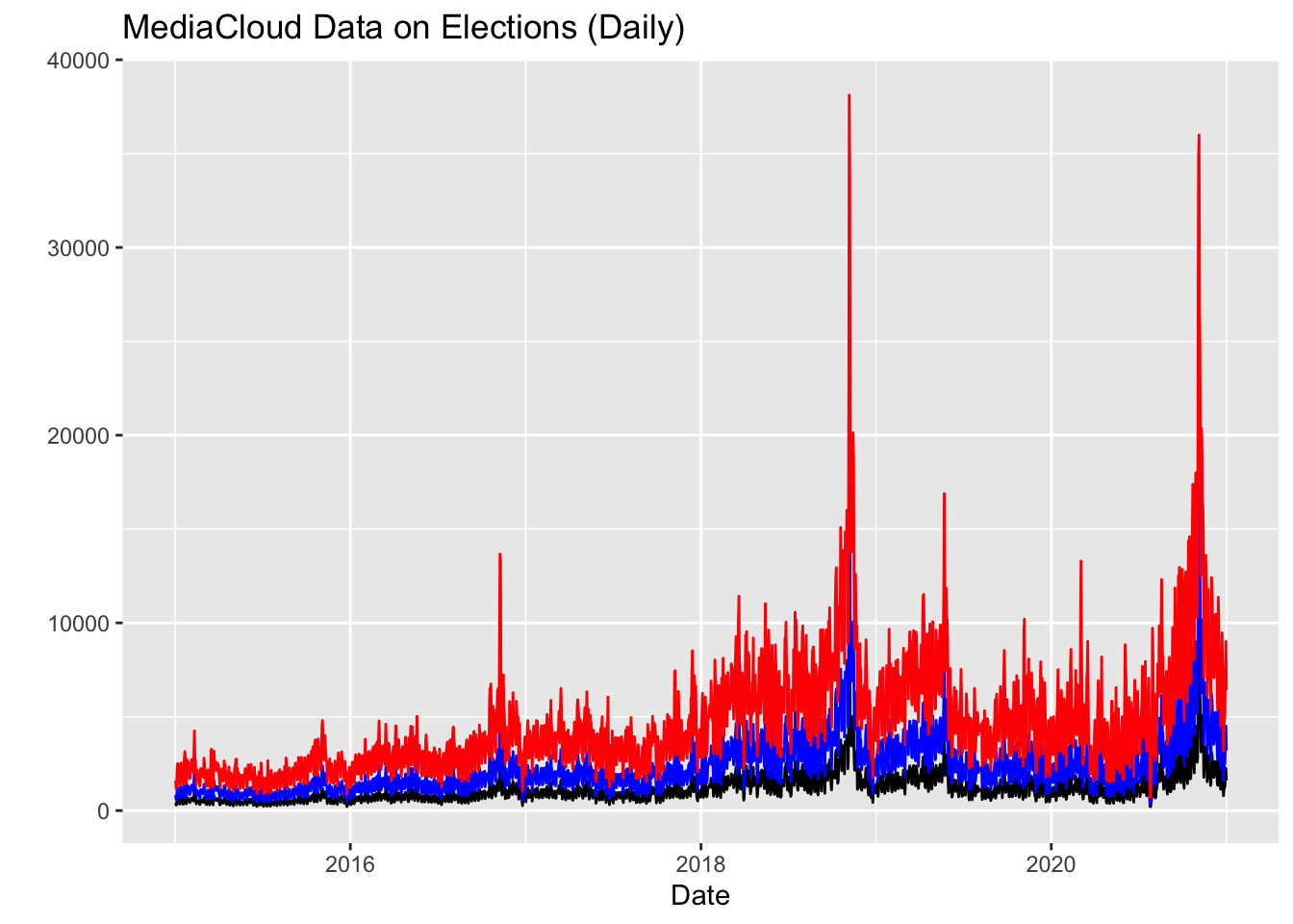 ggtitle("MediaCloud Data on Elections (Daily)")