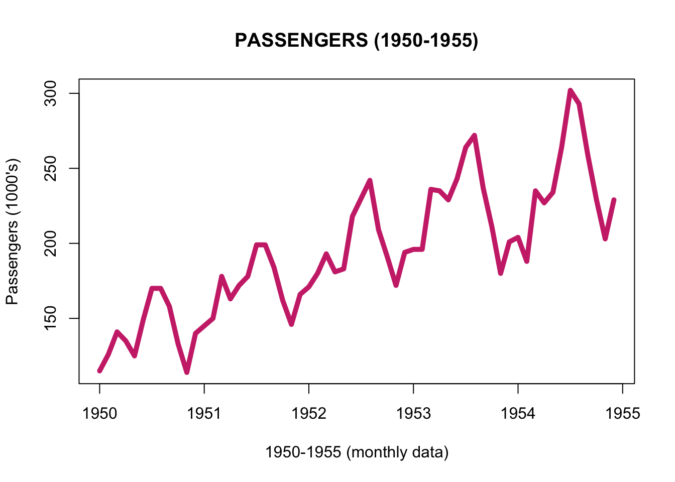 plot.ts(window(AirPassengers, start=c(1950, 01), end=c(1954, 12)),