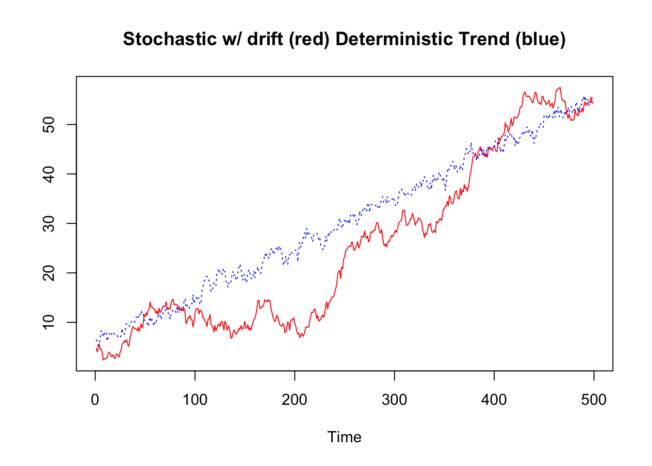 main = "Stochastic w/ drift (red) Deterministic Trend (blue)",
