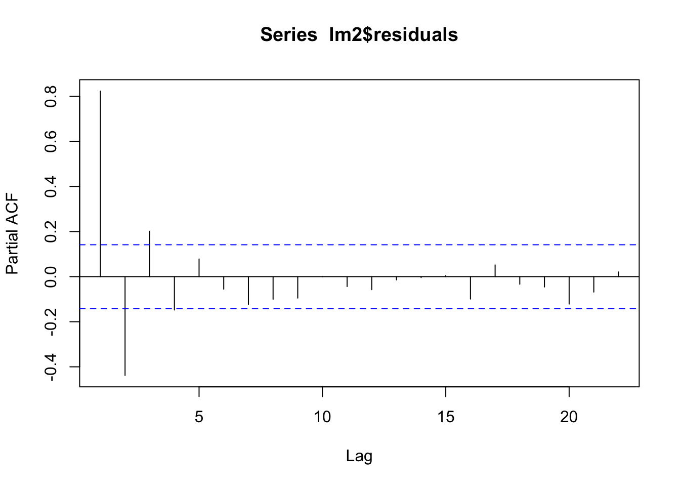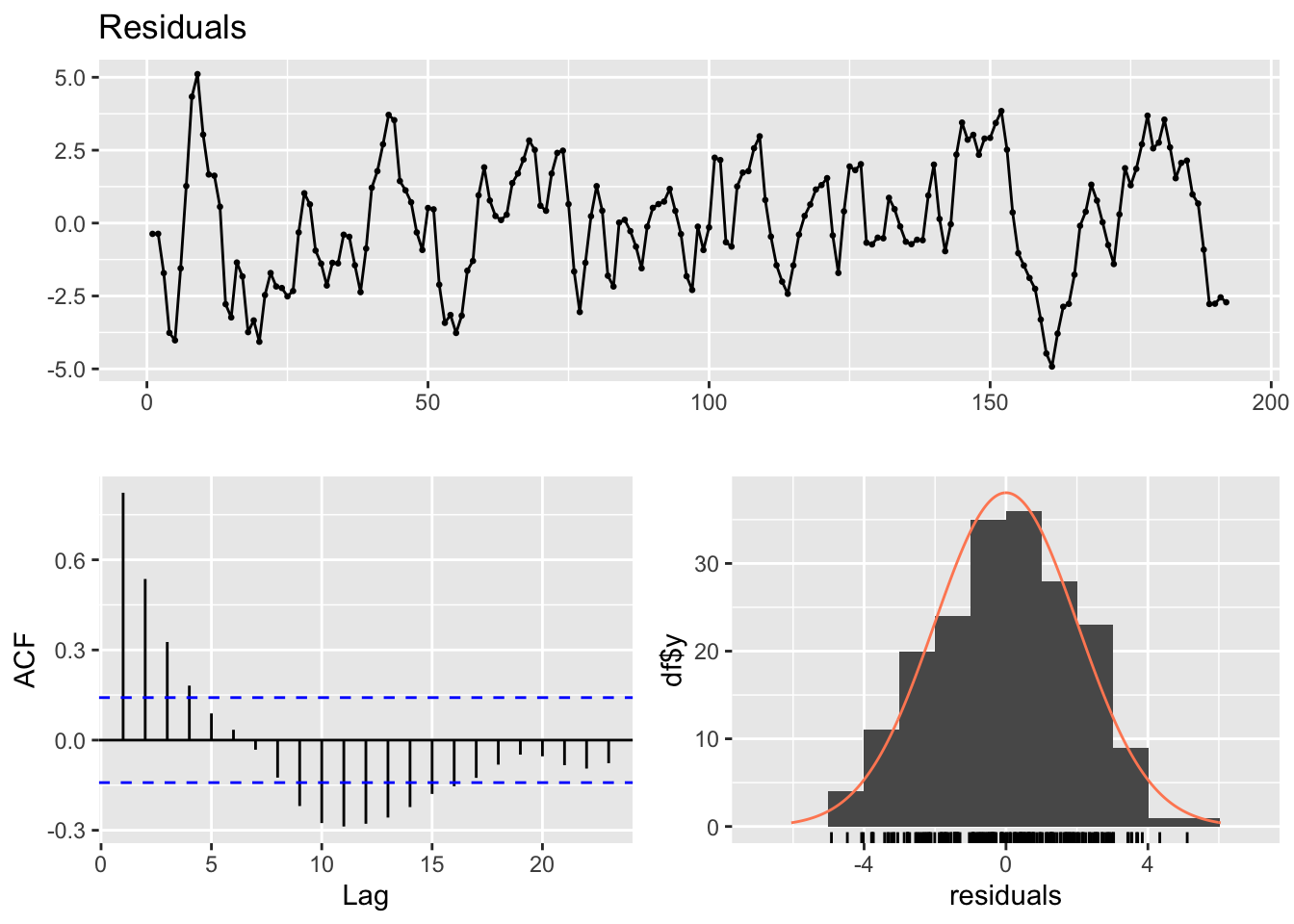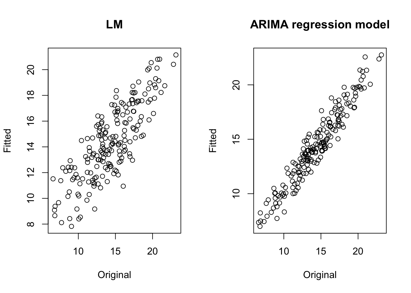 When comparing models by using these criteria, it is important that the models are fitted to the same dataset, otherwise the results are not comparable. This is an important aspect to take into account when using lagged predictors. For instance, you may want to try a model including one lagged predictor \(x_{t-1}\) and a model including two lagged predictors \(x_{t-1}\) and \(x_{t-2}\), and to compare them in order to select the best one according to AIC, AICc or the BIC criterion. However, when you add lagged predictor you loose data points.
