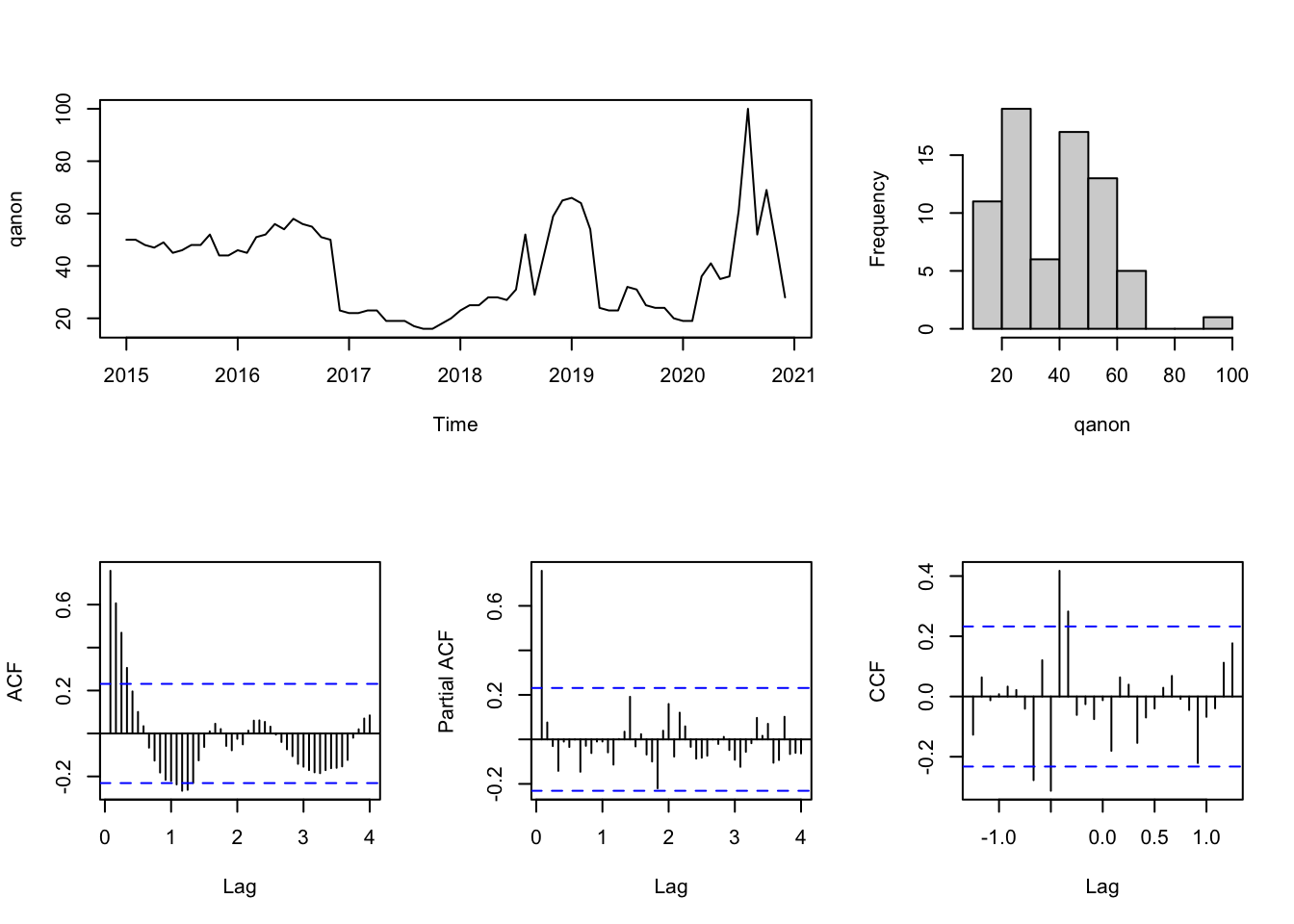 RQ2 sought to determine the time span of linkages between coverage volume and search volume. (…) ARIMA models were run to gauge the dynamics of mutual influence between these two time series. The first model examined the effect of coverage volume on search volume over time (i.e., basic agenda setting) (…) presidential public relations, was included as an additional input series. The first model, with search volume being a single dependent variable, was identified through a close examination of autocorrelation functions (ACFs) and partial autocorrelation functions (PACFs). This analysis revealed a classic autoregressive model for the series (1, 0, 0). […] According to the results, shifts in aggregate search volume over this two-year period were significantly predicted by coverage volume over the prior five weeks (p < .010)* and by presidential public relations efforts in the preceding two, three (p < .001), and five weeks (p < .005). The ARIMA model with two predictors was correctly specified (Ljung–Box Q = 18.132, p = .381) and it explained roughly 35% of the observed variation in the series.