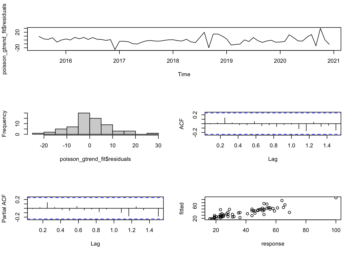 fit1 <- auto.arima(example_data[3:40,1], xreg=example_data[3:40,2])